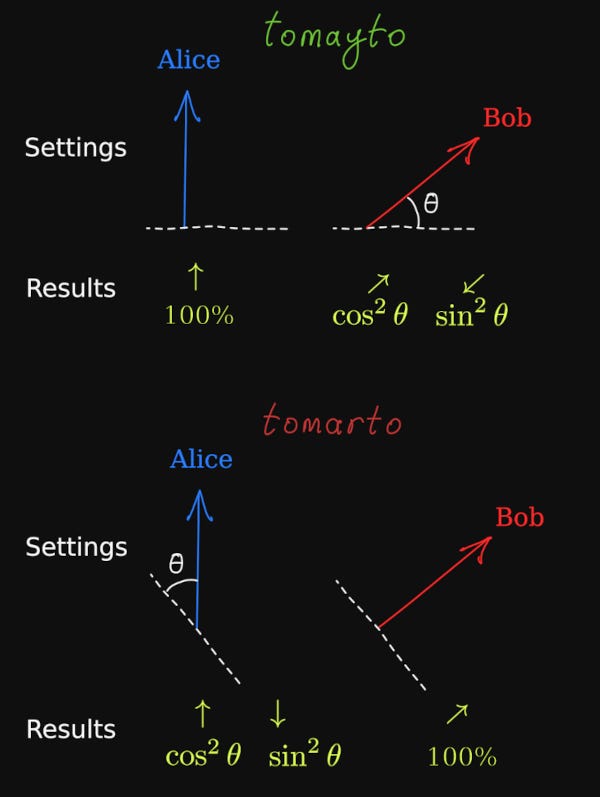 Picture: you see the issue right? Can I be any clearer? Both these cases are exactly the same. The only thing we shifted was in our heads, which reference line to take as defining the angle θ: Alice’s (top) or Bob’s (below). The angle is a fiction, it is gauge.