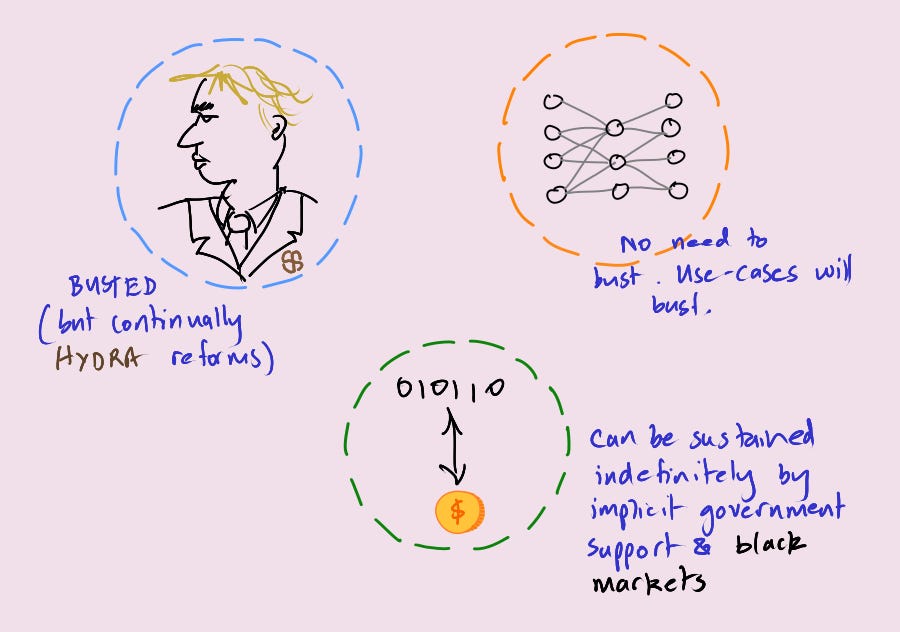 Hey, I’m not gong to make any Oracle pronouncements. The Murph could be correct than one of these tech bubbles could 𝐜𝓸𝖑𝓵𝓪𝕡𝔰𝓮 soon. I’m just saying I do not see why. There are supports direct from government that prop such scams up. In the case of Ai it’s failure to enforce anti-trust, failure to protect consumers, and direct government fiscal support for the tech-bro oligarchs. For Crypto it is austerity, for want of a better catch-all. Government austerity is what drives demand for ponzi “get rich quick” schemes. But also the existence of black markets too, and the imposed “need” for tax havens or in the case of Crypto just escape from tax altogether.